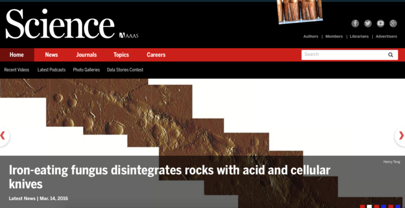 Science对该文章的新闻报道(http://www.sciencemag.org/news/2016/03/iron-eating-fungus-disintegrates-rocks-acid-and-cellular-knives)