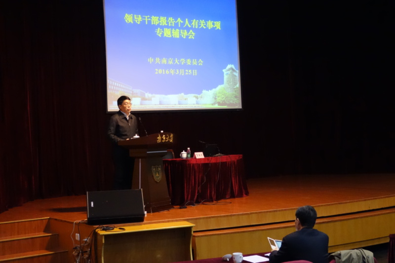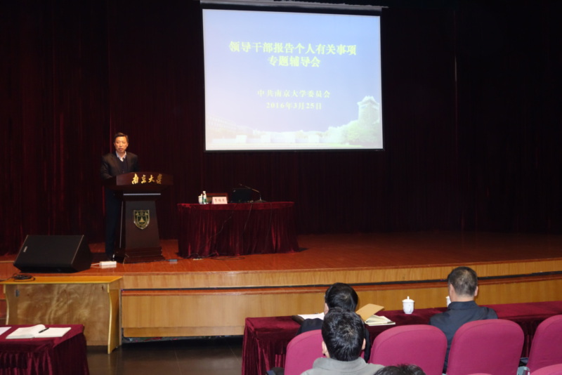 3月25日下午,我校召开领导干部报告个人有关事项专题辅导会。江苏省委组织部干部监督处处长季培东为出席会议的全校两百多名中层干部解读了领导干部报告个人有关事项制度。校党委副书记、纪委书记任利剑就如何更好地实施个人事项报告制度提出了明确要求。会议由校党委常委、组织部部长郭随平主持。
