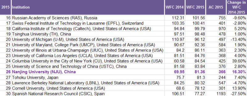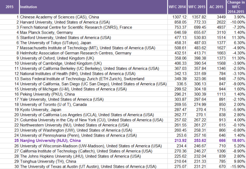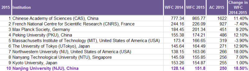 美国当地时间2016年4月20日,自然出版集团发布最新自然指数,(Nature Index 2016),全面衡量全球各个国家/地区、科研院所、高等学校以及产业机构的高水平论文产出,并评估各院校在化学、地球与环境科学、生命科学以及物理科学四个核心学科领域的排名。在国家与地区排名中,中国是全球高质量科研论文的第二大贡献国,仅次于美国。自然指数排行榜展示了最近四年的各年度指数,并全部于4月20日首次对外发布。自然指数依据的是各国或各科研机构对每年发表的约六万篇高质量的科研论文的贡献情况,既计算论文总数,又计算不同国家和机构在每篇论文上的相对贡献。