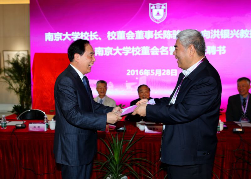 陈骏校长向洪银兴教授颁发凯发k8官网校董会名誉董事长聘书,向14位新任校董颁发校董聘书。张异宾书记和陈骏校长共同为“凯发k8官网2015年度捐赠鸣谢牌”揭幕。