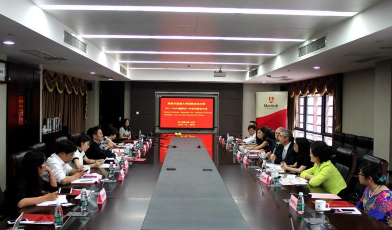 濮励杰校长助理向来宾简要介绍了我校在学科建设、人才培养、科学研究、国际交流与合作等方面的最新发展情况,并回顾了我校与澳大利亚开展高等教育合作的历程,表示非常愿意寻找方式与默多克大学合作交流。默多克大学代表也介绍了学校的整体发展情况以及该校与中国其他高校开展国际合作与交流的具体项目。双方就合作方式、合作领域进行了热烈的交流,一致赞成从学生交流开启合作,加强两校师生交流,以寻找学术研究方面更多的合作空间。
