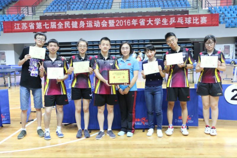 6月26日,江苏省第七届全民健身运动会暨2016年江苏省大学生乒乓球比赛在宁圆满落幕,由我校普通学生组成的乒乓球队在比赛中过关斩将,团结拼搏,最终荣获混合团体第一名。
