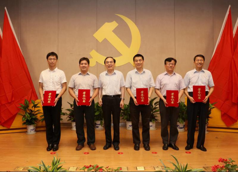 校长陈骏为江苏省优秀共产党员获得者孙建军,江苏省教育系统优秀共产党员获得者丁南庆、孙建军、鹿化煜、潘丙才、伟尧同志颁奖。