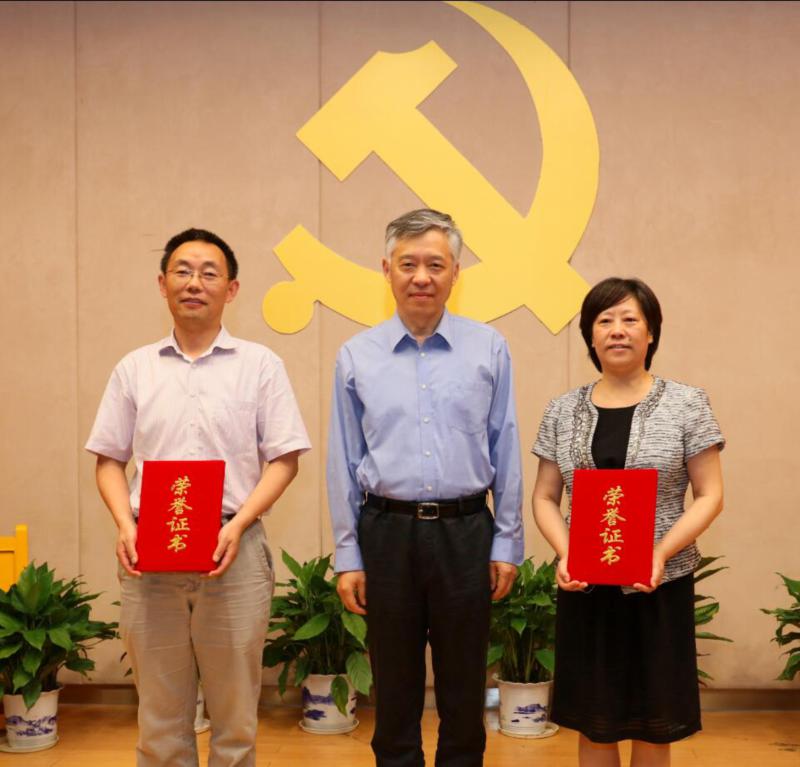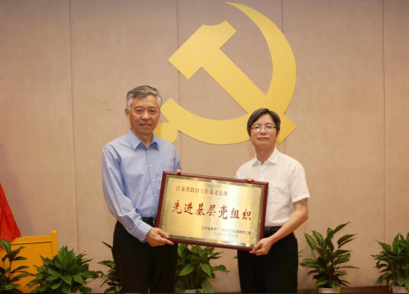 校党委书记张异宾为江苏省教育系统优秀党务工作者获得者贾叙东、韩晓冬同志和江苏省教育系统先进基层党组织获奖单位——机关党委教务处党支部颁奖。