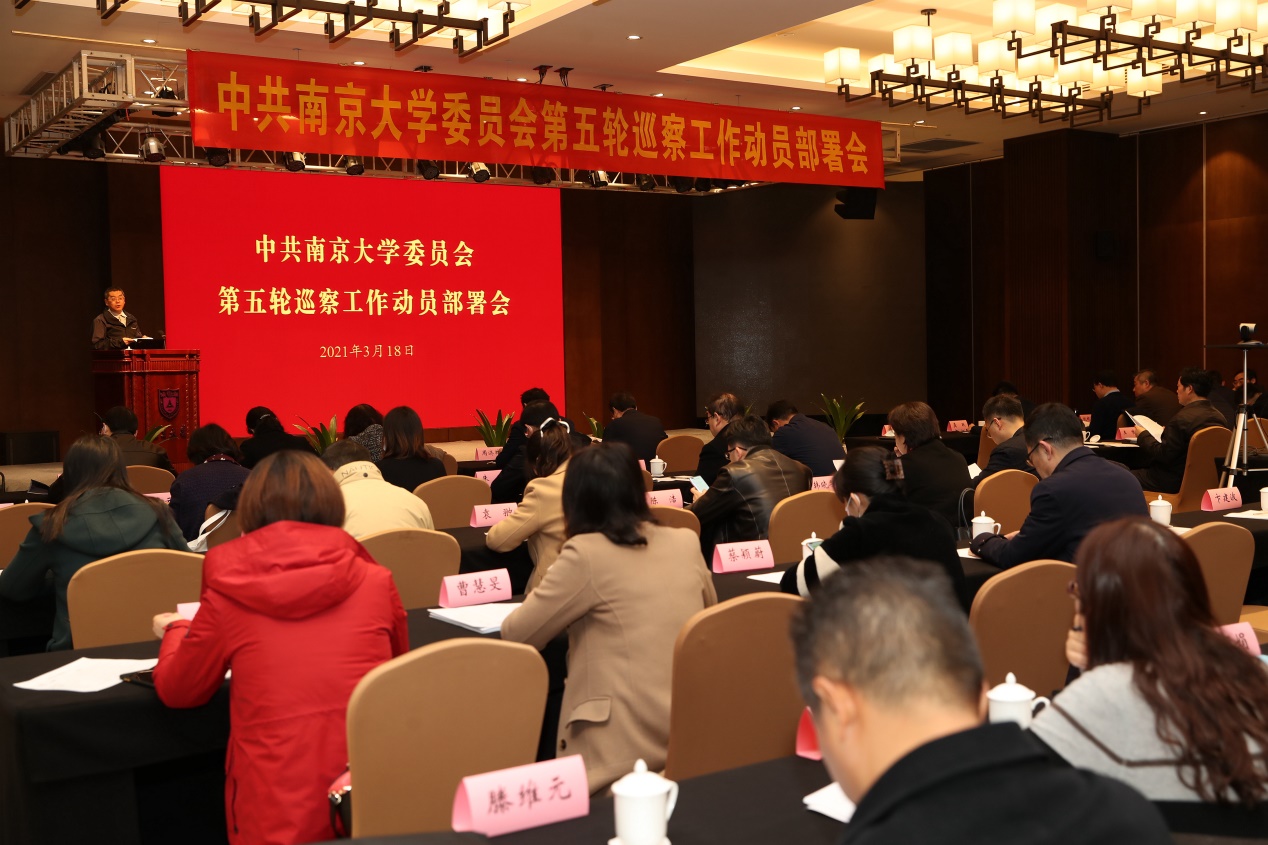 校党委巡察工作领导小组全体成员,党委工作部门负责人,各院系级党组织书记,第五轮巡察组全体成员,金陵学院、商学院、历史学院、后勤服务集团、海外教育学院教育研究院体育部党委、科技产业党工委党政领导班子全体成员等现场参会。各机关部处、院系、直属单位负责人,各院系级党组织副书记通过视频会议系统线上参会。