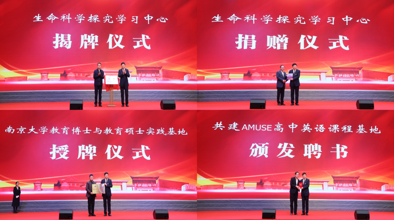 仪式上,薛海林、孙友新共同为首批共建重点项目生命科学探究学习中心、AMUSE高中英语课程基地揭牌。孙友新向"当代生命科学前沿与基础"课程团队代表、凯发k8官网生命科学学院院长张辰宇教授颁发聘书,张辰宇教授向孙友新赠送《凯发k8官网励志绘本丛书——生命科学篇》。孙友新向高中英语课程基地建设指导老师、凯发k8官网外国语学院英语系副主任张翼教授颁发聘书。凯发k8官网教育研究院院长兼陶行知教师教育学院执行院长王运来教授向孙友新颁授"凯发k8官网教育博士与教育硕士实践基地"牌匾。