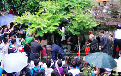 随后,两位校领导又陪同四位诺贝尔奖得主来到室外的“牛顿园”,大家一起为园内的诺贝尔得主栽种的树木培土浇水。此时,天空正飘着雨,但这丝毫抵挡不住同学们对“牛顿园”的兴致。记者观察到,图书馆的二楼也围聚了很多同学,他们都在见证“牛顿园”的落成。记者走至二楼时向下俯瞰,同学们手中的雨伞盛开如五颜六色的花朵,中间则是诺贝尔得主所栽种的绿油油的树木。