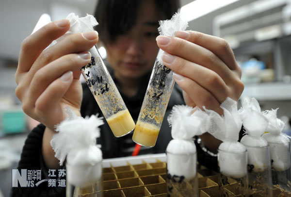 研究人员在观察其培育的模式动物果蝇的发育生长情况。