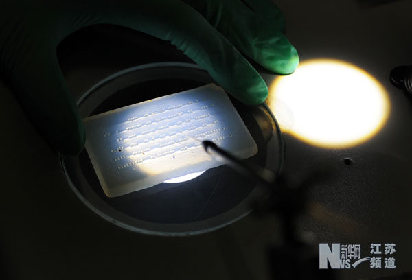 研究人员使用显微注射仪对模式动物斑马鱼的胚胎进行疾病基因导入。