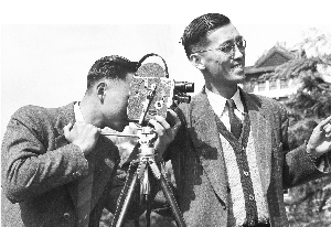中国电影高等教育第一位专职教师孙明经(右)正在金陵大学校园指导学生拍摄(1936年)