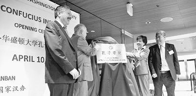 中国国家汉办主任、孔子学院总部总干事许琳(右二)和乔治·华盛顿大学校长史蒂文·纳普(左二)为孔子学院揭牌。