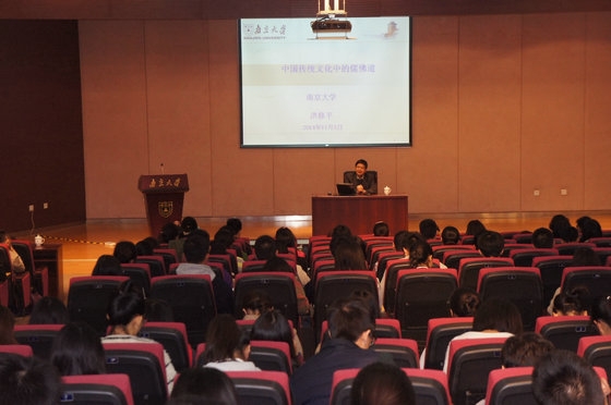 随后,洪教授对儒、佛、道三家进行了形象而生动的阐释。洪教授认为,儒家作为中国传统思想文化的主流和基础,以“仁学”为核心,具有仁礼双重结构,既接续着人文传统,又深受上古三代以来的宗教传统的影响,故具有人文与宗教的两重性。道包括先秦老庄道家和汉代形成的道教,道家重视人的自然性,强调个人的自主、独立和自由,讲避世无为而“归真”,通过效法自然的无为来实现人生,所以说“人法地,地法天,天法道,道法自然”。道教依于道家效法天道的自然论等,通过修“德行”和务“方术”而追求一种超世脱俗、得以永恒的神仙生活,是对道家理论宗教化的产物。佛教以“人生皆苦”为出发点,强调“自作自受”、“自种自收”的“业报轮回”,引导人们“诸恶莫作,众善奉行”,肯定人可以通过自己的努力实现人生永恒幸福的向往。