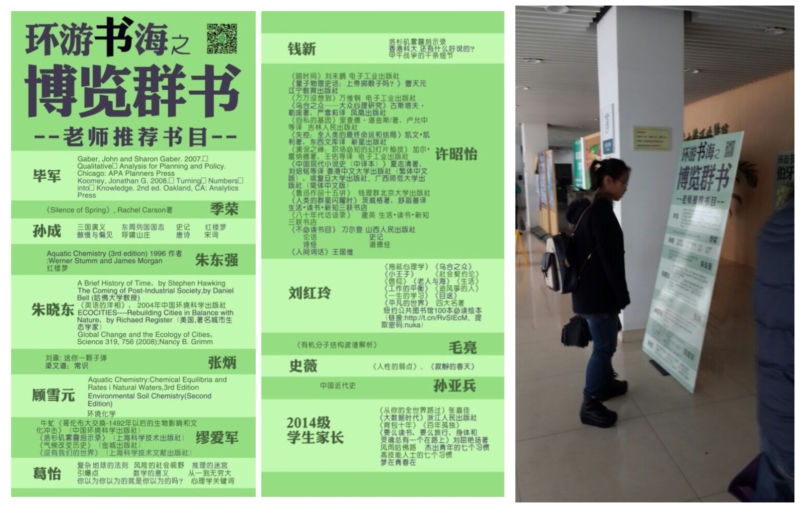 本届读书节邀请到毕军院长等十余位老师推荐深入浅出的专业书籍、适合入门者阅读的英文文献等。环境学院2014级学生家长通过“凯发环院”微信平台了解到“环游书海”活动后,也主动参推荐《风雨哈佛路》、《背包十年》等数十本书籍,和大家分享他们的读书心得。老师与学生家长们的推荐书单一经展出,即受到师生的一致好评。