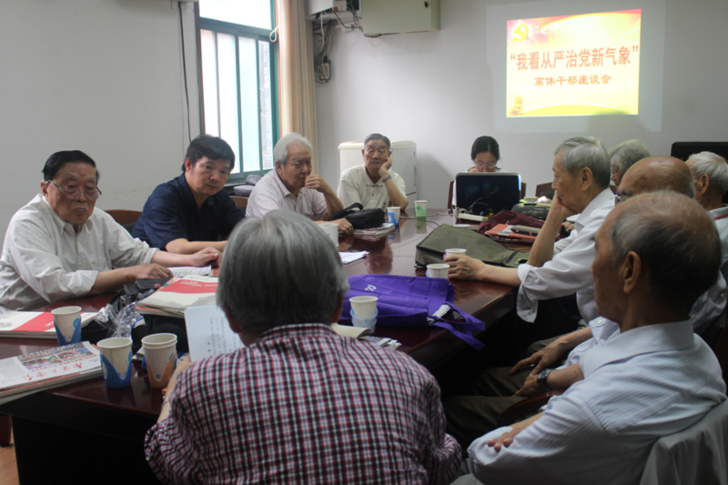老同志们踊跃发言,热烈讨论。姚萍、付德余、潘可洪、邢涛指出,从严治党势在必行,习近平总书记抓住了治国理政的要害,对违规违纪的行为绝不姑息,以抓铁有痕的魄力保证了党的纯洁性,彰显出历史唯物主义者的风范。陈汉民、倪皖荪、魏祥玉、蔡云山认为,从党的创立之初起,党的思想政治建设就是一项久抓不懈的重要任务。习近平总书记提出“不想反、不敢反、不能反”三点,强调加强客观上的约束,使主观的“不想”转变为客观的“不能”,这是新时期关于党的建设的一大创见,也最能体现“全面从严治党”新气象。