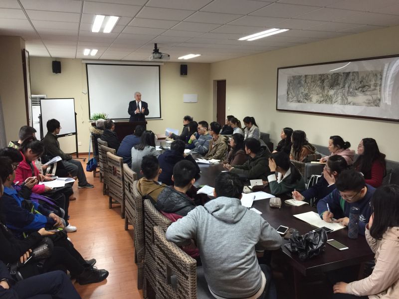 22日上午,迪金森教授作题为“英国脱欧问题的思考”的学术演讲。他介绍了英国脱欧问题出现的历史背景,并从加入欧洲市场、欧洲经济共同体(EEC)的关注、关于欧盟成员资格的全民公投以及全民公投活动及其影响等方面进行了讲述。法华德等同学与迪金森教授积极对话。