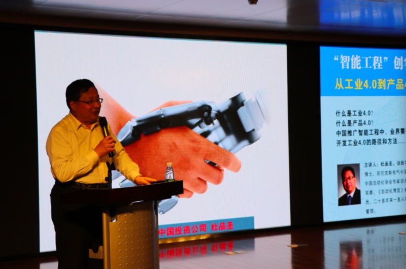 杜品圣博士的报告受到现场师生的热烈欢迎,路演大厅座无虚席。工业4.0已成为社会发展的新动力,但如何正确地走好这条路则仍在探索中。杜博士首先由德国工业界的一些反常现象引发大家对工业4.0的再思考——工业革命之间的内在关系是什么、德国发起工业4.0要解决什么问题以及工业4.0与自动化的发展是什么关系?杜博士详细深入地阐述了他对这三个问题的思考,并对在座学生寄语,希望同学们要做产品产业化人才金字塔顶部的“金领”,要做互联网时代的创新型人才。