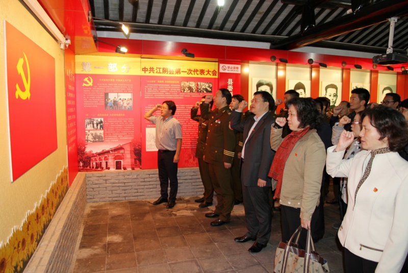 三方党支部共建活动开始后,党员集体参观了中共江阴一大会址纪念馆,详细了解了中共江阴县第一次代表大会、新民主主义革命时期中共江阴县级领导机构发展演变等内容。面对鲜红的党旗,全体党员同志举起右拳,重温了入党誓词。