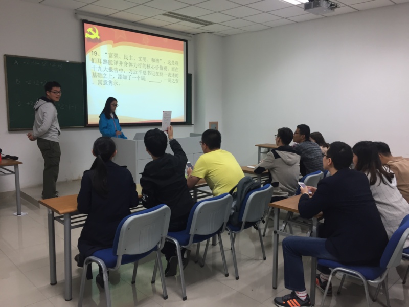 知识竞赛环节由组织委员陈叶朦主持,纪检委员纪铭曦负责计分。参与者分为三组进行答题,采用顺序作答、抢答选择题等形式。问题主要包括十九大报告中的要点、党史党建等内容。竞赛现场气氛活跃,答题计时、计分使得参与者思想高度集中,具有紧张紧迫感。对题目中有疑问的地方,党员们展开了热烈讨论,将比赛推入高潮。最终A组的韩诗颖、李康与朱江同学连续抢到并答对多题,赢得竞赛。