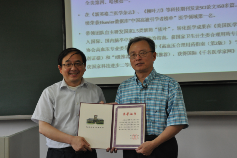 徐希平的主讲课题是“多靶点复方化学药物研发的意义、现状与展望”。多靶点复方化学药物作为全球新药研发的重要组成部分,也是重大疾病领域的一种国际化趋势,具有通过多靶点协同效应、降低副作用、提高临床疗效以及提高依从性等显著优势,在丙肝、心衰、脑卒中预防、艾滋病等领域防治中均取得突破性进展。通过对中美两国十大致死疾病因素的比较,徐希平发现脑血管疾病是威胁我国居民健康的“第一死亡杀手”,在我国脑卒中发病率和死亡率不断攀升的同时,西方国家的脑卒中死亡率在不断回落。因此,徐希平决定将基础科研成果运用中国人群健康的重大需求中。其带领团队自主研发的国家1.5类新药“依叶”,在高血压防治与脑卒中个体化预防的循证医学研究中,探索出了一条复方新药创制之路,为有效预防脑卒中提供了重要工具。他研发的新药已经被载入国际、国内脑卒中和高血压防治指南,获得国家卫生计生委合理用药专家委员会和中国医师协会高血压专业委员会组织编写的《高血压合理用药指南(第2版)》“A级证据”(最高级别证据)和“I级推荐”(最高级别推荐),荣获2016年国家科技进步二等奖。
