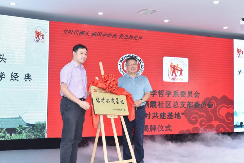 活动回顾了我校哲学系和栖霞街道栖霞社区合作五年来在深化党建引领、推动实践交流等方面所取得的成果,尤其突出了“青少年国学启蒙班”的品牌、示范效应。哲学系党委副书记孟振华、栖霞街道工委副书记陈峰为校地双方结对共建基地揭牌。哲学系副主任李跃华和栖霞社区党总支书记戴兴华共同签署双方结对共建、协同开展党建活动及实践活动的协议。