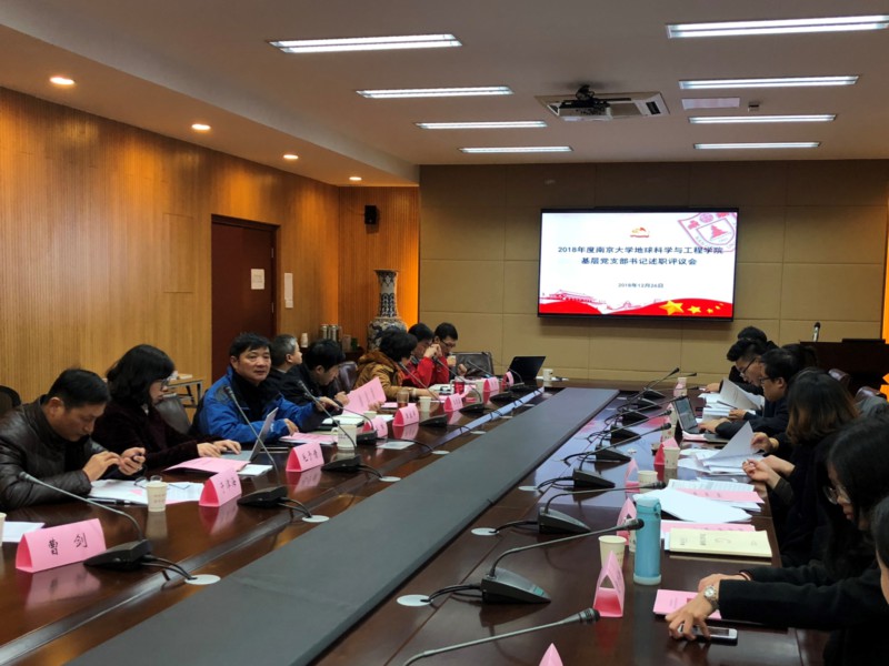 王唯通报了地科院党委一年来落实基层党建工作情况。地质工程、构造古生物、水文、地化矿床、岩矿、行政与国家重点实验室等六个教工支部以及本科生、硕士生和博士生等十个学生支部的支部书记相继进行述职,实现了现场述职全覆盖。各支部书记按照凯发k8官网关于基层党支部建设的相关要求认真准备,分别从党支部书记履行抓基层党建工作第一责任人情况、全面学习贯彻习近平新时代中国特色社会主义思想和党的十九大精神、推进“两学一做”学习教育常态化制度化、落实“七个有力”要求以及存在的问题和改进工作的思路措施等方面全面汇报了2018年度基层党支部工作开展情况。地科院党委委员认真听取了各支部书记的述职汇报,并进行点评和打分。