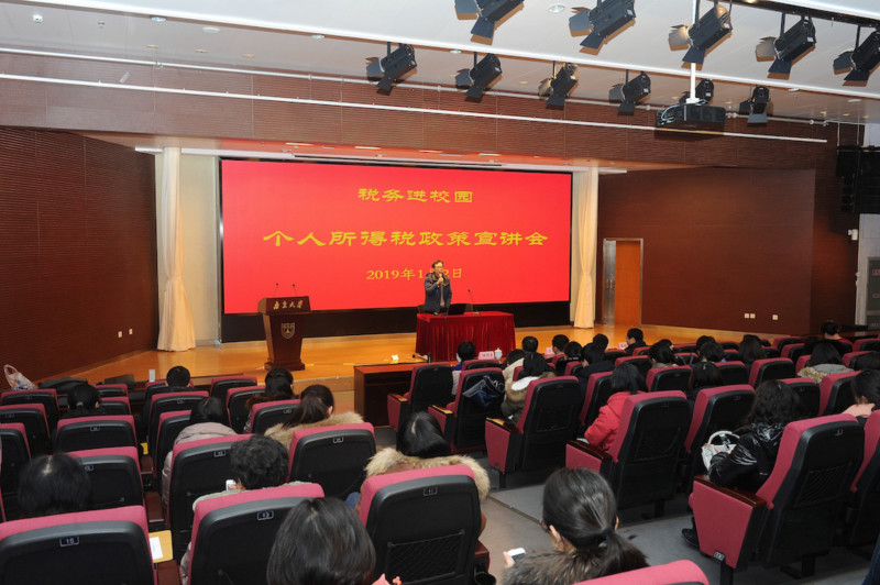 为进一步落实《中华人民共和国个人所得税法》《中华人民共和国个人所得税法实施条例》等个人所得税政策,让我校教职工充分享受综合所得新税率、专项附加扣除新政策等税收政策红利,1月2日下午,由凯发k8官网市税务局主办、凯发k8官网承办的税务进高校“新个人所得税政策宣讲会”在我校仙林校区杜厦图书馆一楼报告厅举行。凯发k8官网市税务局个人所得税处负责人王建兵、我校财务处处长黄力及三百余名师生参加宣讲会。财务处副处长葛晓冬主持会议。